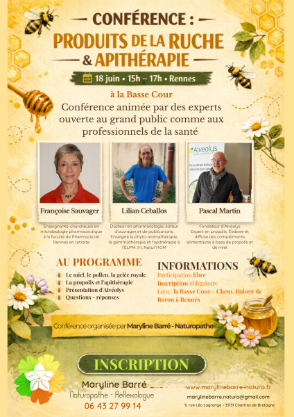 J'ai le plaisir de vous inviter à une conférence sur les produits de la ruche et l'apithérapie avec 3 experts le jeudi 18 juin à 15h à la Basse Cour à Rennes :